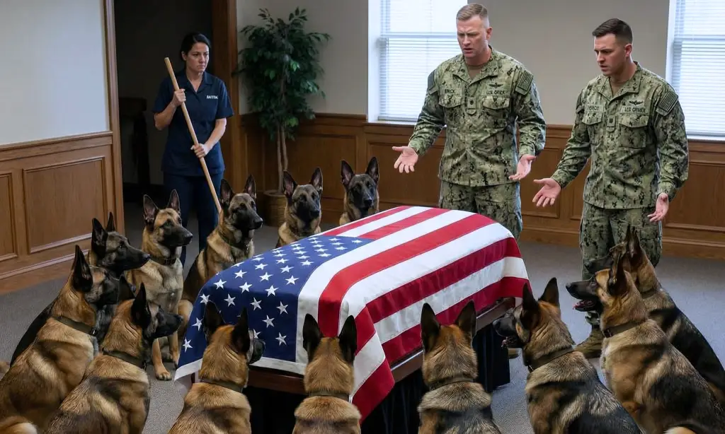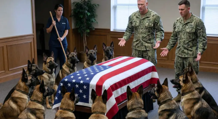 Twelve military working dogs—Belgian Malinois and German Shepherds—sat in a perfect, unbroken circle around the flag-draped casket at the center of the memorial hall. Their bodies were rigid, muscles coiled tight beneath fur, eyes locked forward. Not one flinched. Not one obeyed.